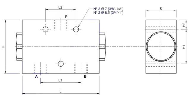 | P | A - B | L | L1 | L2 | H | H1 | H2 | S |