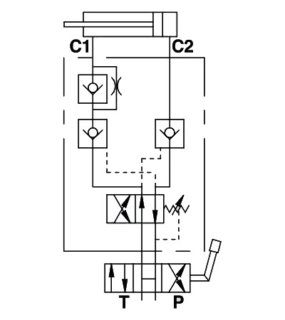 Клапан оснащений подвійним пілотованим зворотним клапаном, який забезпечує контроль витоків у будь-якому положенні циліндра.