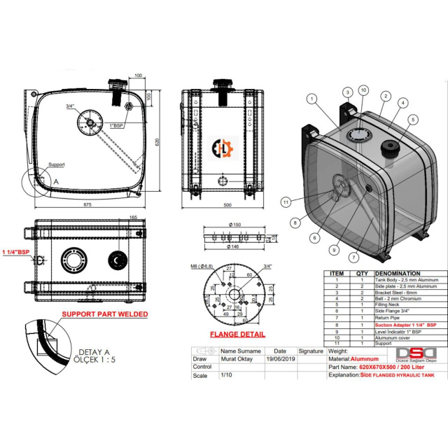 Компанія Duzce Saglam Depo створює оригінальні алюмінієві гідравлічні баки всіх видів. Крім звичайних розмірів, вони мають спеціальну лінійку продукції. Використовуваний алюміній високої якості відповідно до стандартів BS EN 10204/3.1 – це сплав 5754, загартований до стану H111.