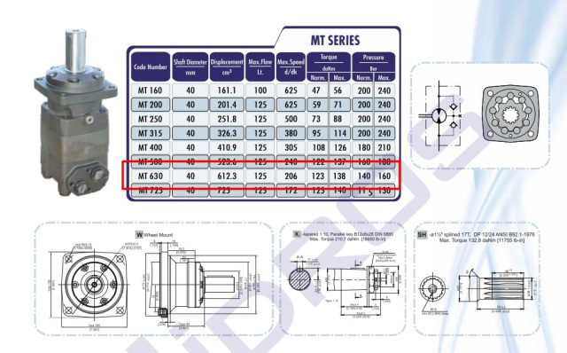 Гідромотор M+S Hydraulic MT 630 з робочим об'ємом: 631.2 см³/об і потужністю 24.3 кВт. Належить до серії низькошвидкісних. Гідромотори серії MT відмінно підходять для тривалої роботи у важких умовах — наприклад, при високому тиску, використанні рідкої оливи або частій зміні напрямку обертання. Посилені конічні роликові підшипники дозволяють легко справлятися з високими радіальними навантаженнями, як статичними, так і динамічними. Спеціальна конструкція допомагає мінімізувати втрати у системі. В результаті двигуни демонструють високу ефективність і легкий запуск навіть при серйозних навантаженнях. Доступні різні варіанти валів, фланців та портів.