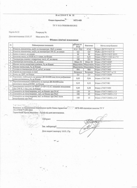 Наша компанія рекомендує придбати МГЕ 46-В - мінеральну оливу найвищої якості, призначену для застосування в гідросистемах гідрооб'ємних передачах та гідростатичних приводів різної техніки. Зокрема, воно добре собі зарекомендувало у роботі на будівельному, сільському, дорожньому спецтранспорті, яке функціонує в інтенсивному режимі та важких умовах. Продукт зберігає свої властивості при робочій температурі від -10 до +80°C і при тиску до 35 МПа з можливим підвищенням короткочасного характеру до 42 МПа.