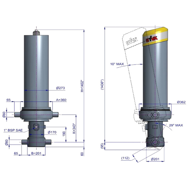 Цей циліндр є лише підйомним пристроєм. Його не слід використовувати як елемент конструкції і не слід піддавати бічним навантаженням. Перекидальний клапан повинен мати скидання тиску на отворі циліндра, встановлене не вище макс. робочого тиску Перевірте максимальне навантаження на циліндр. Робочий діапазон температур становить від -40°C до +80°C. Максимальна тривалість висування становить 0,5 години (за винятком загартованих ступенів із твердим хромуванням). Циліндр пофарбований у чорний колір (RAL9005) з мінімальною товщиною покриття, що відповідає 480-годинному випробуванню в нейтральному сольовому тумані згідно з ISO 9227. ¹ Обмежувач ходу циліндра Hyva.
