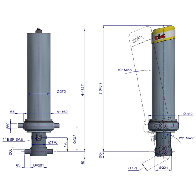 Цей циліндр є лише підйомним пристроєм. Його не слід використовувати як елемент конструкції і не слід піддавати бічним навантаженням. Перекидальний клапан повинен мати скидання тиску на отворі циліндра, встановлене не вище макс. робочого тиску Перевірте максимальне навантаження на циліндр. Робочий діапазон температур становить від -40°C до +80°C. Максимальна тривалість висування становить 0,5 години (за винятком загартованих ступенів із твердим хромуванням). Циліндр пофарбований у чорний колір (RAL9005) з мінімальною товщиною покриття, що відповідає 480-годинному випробуванню в нейтральному сольовому тумані згідно з ISO 9227. ¹ Обмежувач ходу циліндра Hyva.