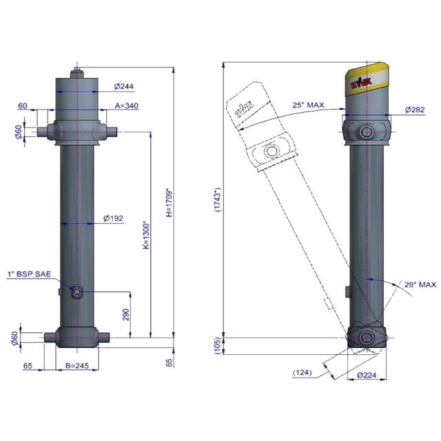Цей циліндр є лише підйомним пристроєм. Його не слід використовувати як елемент конструкції і не слід піддавати бічним навантаженням. Перекидальний клапан повинен мати скидання тиску на отворі циліндра, встановлене не вище макс. робочого тиску Перевірте максимальне навантаження на циліндр. Робочий діапазон температур становить від -40°C до +80°C. Максимальна тривалість висування становить 0,5 години (за винятком загартованих ступенів із твердим хромуванням). Циліндр пофарбований у чорний колір (RAL9005) з мінімальною товщиною покриття, що відповідає 480-годинному випробуванню в нейтральному сольовому тумані згідно з ISO 9227. ¹ Обмежувач ходу циліндра Hyva.