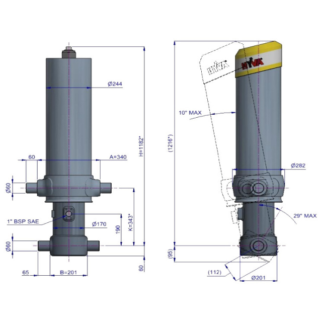 Цей циліндр є лише підйомним пристроєм. Його не слід використовувати як елемент конструкції і не слід піддавати бічним навантаженням. Перекидальний клапан повинен мати скидання тиску на отворі циліндра, встановлене не вище макс. робочого тиску Перевірте максимальне навантаження на циліндр. Робочий діапазон температур становить від -40°C до +80°C. Максимальна тривалість висування становить 0,5 години (за винятком загартованих ступенів із твердим хромуванням). Циліндр пофарбований у чорний колір (RAL9005) з мінімальною товщиною покриття, що відповідає 480-годинному випробуванню в нейтральному сольовому тумані згідно з ISO 9227. ¹ Обмежувач ходу циліндра Hyva.