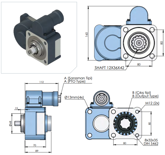 Приєднувальний стандарт: Вал B8x32x36 (8 шліців, Ø36 мм), монтажний фланець ISO (4 отвори, 80x80 мм).