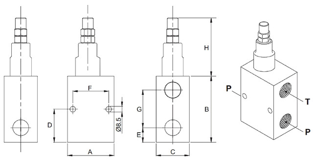 P : підключення насоса = ¾", T : підключення бака = ¾"