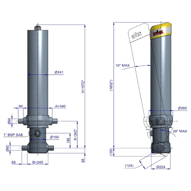 Цей циліндр є лише підйомним пристроєм. Його не слід використовувати як елемент конструкції і не слід піддавати бічним навантаженням. Перекидальний клапан повинен мати скидання тиску на отворі циліндра, встановлене не вище макс. робочого тиску Перевірте максимальне навантаження на циліндр. Робочий діапазон температур становить від -40°C до +80°C. Максимальна тривалість висування становить 0,5 години (за винятком загартованих ступенів із твердим хромуванням). Циліндр пофарбований у чорний колір (RAL9005) з мінімальною товщиною покриття, що відповідає 480-годинному випробуванню в нейтральному сольовому тумані згідно з ISO 9227. ¹ Обмежувач ходу циліндра Hyva.