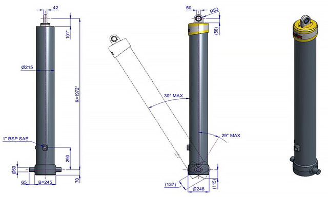 Цей циліндр є лише підйомним пристроєм. Його не слід використовувати як елемент конструкції і не слід піддавати бічним навантаженням. Перекидальний клапан повинен мати скидання тиску на отворі циліндра, встановлене не вище макс. робочого тиску Переконайтеся у максимальному навантаженні на циліндр. Робочий діапазон температур становить від -40°C до +80°C. Максимальна тривалість висування становить 0,5 години (за винятком загартованих ступенів із твердим хромуванням).Циліндр пофарбований у чорний колір (RAL9005) з мінімальною товщиною покриття, що відповідає 480-годинному випробуванню в нейтральному сольовому тумані згідно з ISO 9227. ¹ Обмежувач ходу циліндра Hyva.