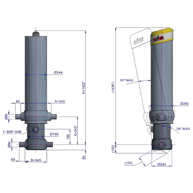 Цей циліндр є лише підйомним пристроєм. Його не слід використовувати як елемент конструкції і не слід піддавати бічним навантаженням. Перекидальний клапан повинен мати скидання тиску на отворі циліндра, встановлене не вище макс. робочого тиску Перевірте максимальне навантаження на циліндр. Робочий діапазон температур становить від -40°C до +80°C. Максимальна тривалість висування становить 0,5 години (за винятком загартованих ступенів із твердим хромуванням). Циліндр пофарбований у чорний колір (RAL9005) з мінімальною товщиною покриття, що відповідає 480-годинному випробуванню в нейтральному сольовому тумані згідно з ISO 9227. ¹ Обмежувач ходу циліндра Hyva.