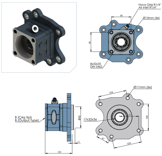 Стандарт приєднання: Вал B8x32x36 (8 шліців, Ø36 мм), монтажний фланець ISO (4 отвори, 80x80 мм).