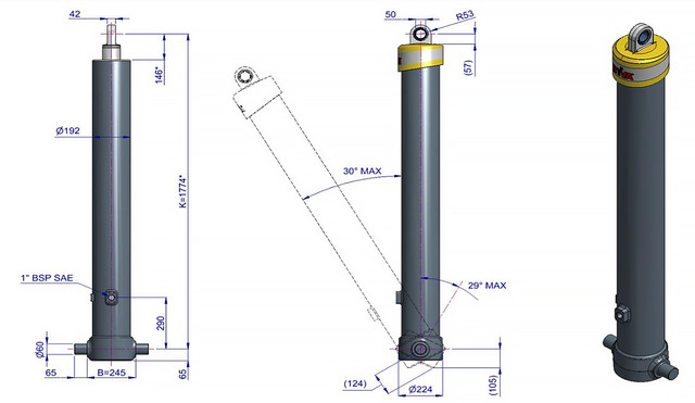 Цей циліндр є лише підйомним пристроєм. Його не слід використовувати як елемент конструкції і не слід піддавати бічним навантаженням. Перекидальний клапан повинен мати скидання тиску на отворі циліндра, встановлене не вище макс. робочого тиску Переконайтеся у максимальному навантаженні на циліндр. Робочий діапазон температур становить від -40°C до +80°C. Максимальна тривалість висування становить 0,5 години (за винятком загартованих ступенів із твердим хромуванням).Циліндр пофарбований у чорний колір (RAL9005) з мінімальною товщиною покриття, що відповідає 480-годинному випробуванню в нейтральному сольовому тумані згідно з ISO 9227. ¹ Обмежувач ходу циліндра Hyva.