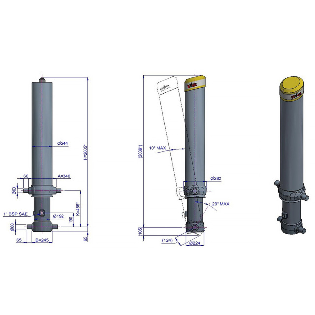 Створений для різноманітних застосувань, цей гідроциліндр з діаметром 169 мм і 5 штоками може піднімати до 46 тонн, досягаючи загального ходу 8130 мм. З максимальним робочим тиском 190 бар цей гідроциліндр від Hyva може піднімати великі навантаження, що, в свою чергу, дозволяє використовувати більш компактні гідроциліндри на вантажівках, економлячи місце та вагу. Циліндр підйому кузова FC A169-5-08130-000-K0486 з серії Alpha в основному використовується у поєднанні з прямим з'єднанням корпусу та цапфовим типом з'єднання.