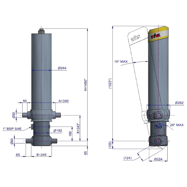 Цей циліндр є лише підйомним пристроєм. Його не слід використовувати як елемент конструкції і не слід піддавати бічним навантаженням. Перекидальний клапан повинен мати скидання тиску на отворі циліндра, встановлене не вище макс. робочого тиску Перевірте максимальне навантаження на циліндр. Робочий діапазон температур становить від -40°C до +80°C. Максимальна тривалість висування становить 0,5 години (за винятком загартованих ступенів із твердим хромуванням). Циліндр пофарбований у чорний колір (RAL9005) з мінімальною товщиною покриття, що відповідає 480-годинному випробуванню в нейтральному сольовому тумані згідно з ISO 9227. ¹ Обмежувач ходу циліндра Hyva.