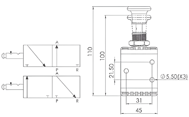 Пневмоклапан з ручним керуванням – HpTech HP.9P101100 (1/4", 3x2)