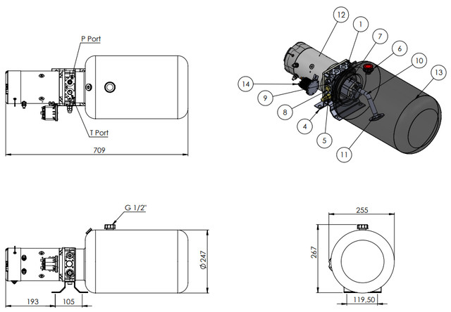 Міні-маслостанція Hydro-pack HPP 1156 призначена для роботи з різними гідроциліндрами. Вона оснащена електромотором потужністю 3.0 кВт і працює при напрузі 24 В DC, швидкість обертання 3500 об/хв, максимальний робочий тиск до 110 бар. Насос станції має робочий об’єм 3.7 см3/об. Масляний бак об'ємом 18 л виготовлений зі сталі й має циліндричну форму. Пристрій встановлюється в горизонтальному положенні.
