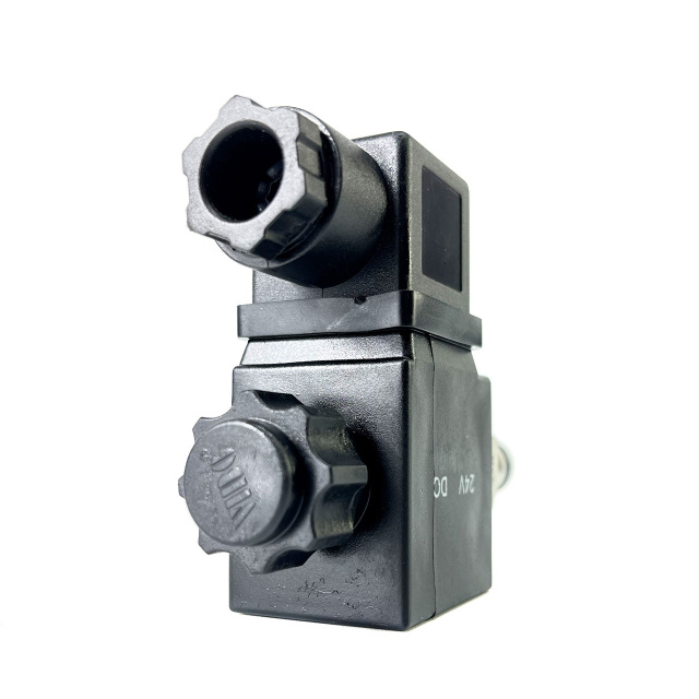 Нормально закритий гідравлічний клапан Renman, використовується в міні-маслостанціях та іншому обладнанні для керування подачею робочої рідини. Працює від живлення 24 В DC: у початковому стані клапан закритий і відкривається при подачі напруги, забезпечуючи надійну та безпечну роботу гідросистеми.