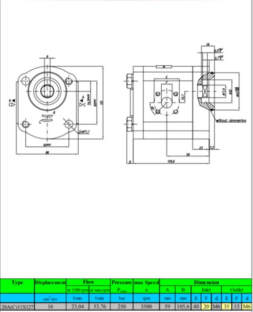 Гідравлічний шестеренний насос Hydro-pack 20A12X127 групи 20, з об'ємом 12 см3/об, має ліве обертання (проти годинникової стрілки). Використовується для встановлення на трактор.