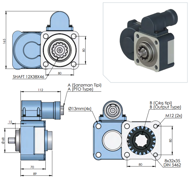 Стандарт приєднання: Вал B8x32x36 (8 шліців, Ø36 мм), монтажний фланець ISO (4 отвори, 80x80 мм).