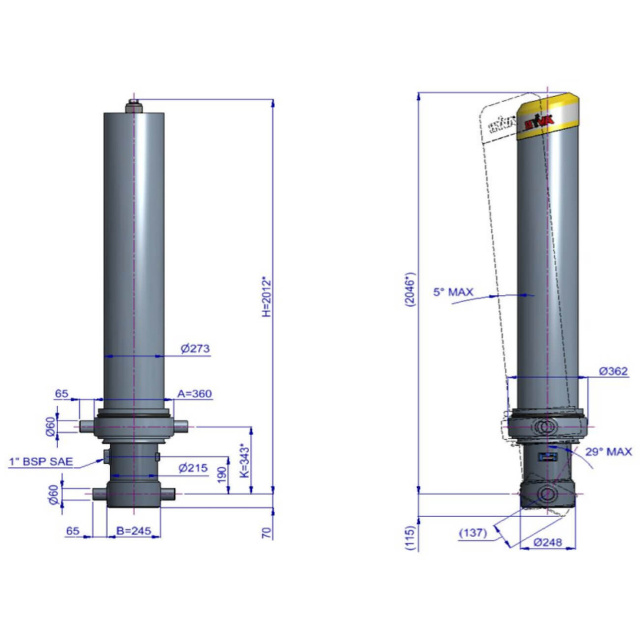 Цей гідроциліндр, призначений для широкого спектра завдань, має діаметр 191 мм та оснащений 6 штоками, що дозволяє піднімати вантажі масою до 40 тонн при загальному ході 9500 мм. Максимальний робочий тиск 170 бар забезпечує можливість роботи з великими навантаженнями, дозволяючи встановлювати більш компактні циліндри на вантажівки, економлячи простір та знижуючи вагу конструкції. Модель FC A191-6-09500-079-K0343-HC серії Alpha застосовується переважно з прямим корпусним з’єднанням та цапфовим кріпленням.