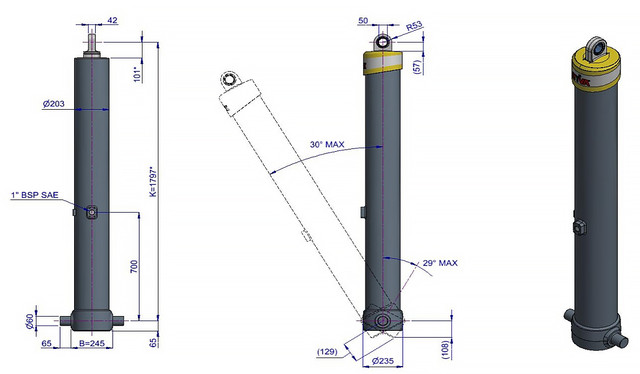 Цей циліндр є лише підйомним пристроєм. Його не слід використовувати як елемент конструкції і не слід піддавати бічним навантаженням. Перекидальний клапан повинен мати скидання тиску на отворі циліндра, встановлене не вище макс. робочого тиску Переконайтеся у максимальному навантаженні на циліндр. Робочий діапазон температур становить від -40°C до +80°C. Максимальна тривалість висування становить 0,5 години (за винятком загартованих ступенів із твердим хромуванням).Циліндр пофарбований у чорний колір (RAL9005) з мінімальною товщиною покриття, що відповідає 480-годинному випробуванню в нейтральному сольовому тумані згідно з ISO 9227. ¹ Обмежувач ходу циліндра Hyva.