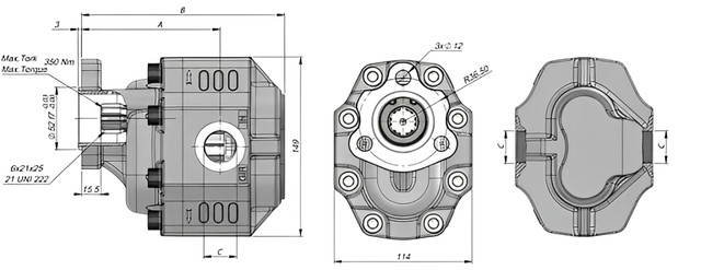 Гідравлічний шестеренний насос Hydro-pack G30043UF431 з об'ємом 43 см3/об. Насос обертається як у праву сторону (за годинниковою стрілкою збоку валу), так і в ліву (проти часникової стрілки). У стандартному виконанні поставляється із трикутним фланцем стандарту UNI з 3 отворами та шліцевим валом. Використовується в самоскидах та маніпуляторах.