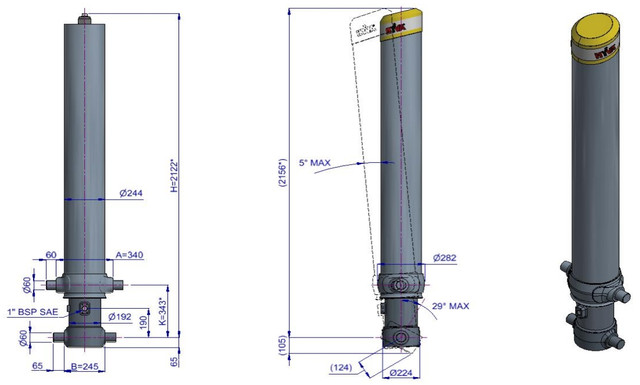 Створений для різноманітних застосувань, цей гідроциліндр з діаметром 169 мм і 5 штоками може піднімати до 40 тонн, досягаючи загального ходу 8530 мм. З максимальним робочим тиском 170 бар цей гідроциліндр від Hyva може піднімати великі навантаження, що, в свою чергу, дозволяє використовувати більш компактні гідроциліндри на вантажівках, економлячи місце та вагу. Циліндр підйому кузова FC A169-5-08530-004-K0343 з серії Alpha в основному використовується у поєднанні з прямим з'єднанням корпусу та цапфовим типом з'єднання.