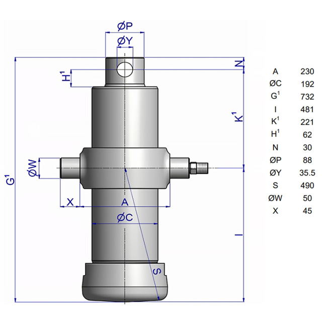 Циліндр легкий, використовує менше масла, що дозволяє швидше підіймати та опускати кузов, і він міцний та не вимагає обслуговування. Кидкова маса розрахована на 220 бар. Елементи кріплення слід замовляти окремо.