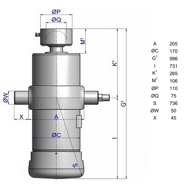 Модель UMB 149-4-2980-K265-50-3/4"-HC від HYVA - це надійний гідравлічний циліндр із 4 штоками, розрахований на підйом вантажів вагою від 19 до 31 тонни. З робочим тиском до 220 бар та діаметром першого штока 149 мм він забезпечує ефективне та безпечне виконання вантажопідйомних операцій. Загальна довжина циліндра у розкритому стані становить 2980 мм, що дозволяє справлятися з широким спектром завдань. Цей гідроциліндр — надійне рішення для роботи в інтенсивних умовах, де потрібні міцність, продуктивність та якість.