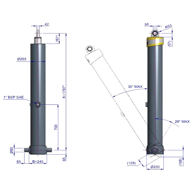 Фронтальний циліндр Hyva FE A179-5-07080-019-K1797 з одним вушком (FE) має 5 штоків і здатний піднімати до 50 тонн, досягаючи загального ходу 7080 мм при тиску 170 бар. Ефективний діаметр складає 179 мм, а вага циліндра становить 291 кг.