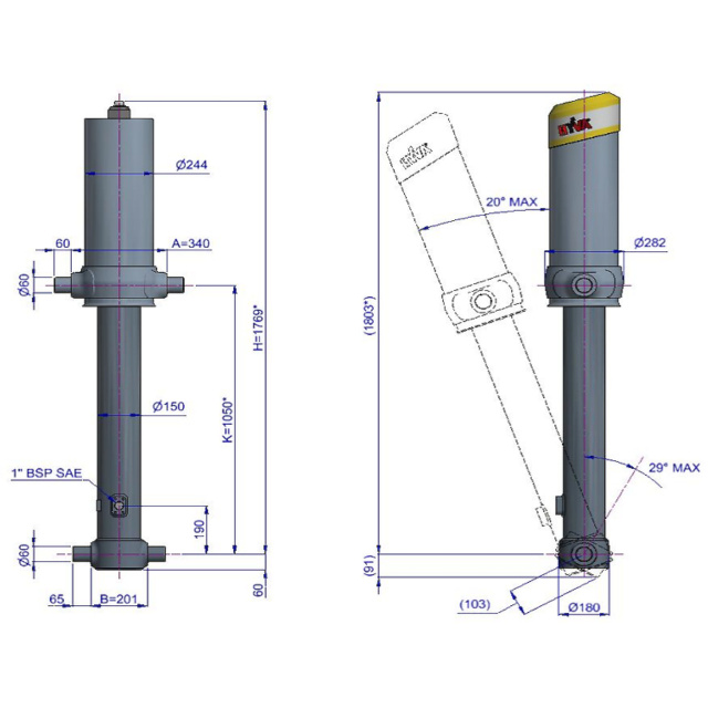 Цей циліндр є лише підйомним пристроєм. Його не слід використовувати як елемент конструкції і не слід піддавати бічним навантаженням. Перекидальний клапан повинен мати скидання тиску на отворі циліндра, встановлене не вище макс. робочого тиску Перевірте максимальне навантаження на циліндр. Робочий діапазон температур становить від -40°C до +80°C. Максимальна тривалість висування становить 0,5 години (за винятком загартованих ступенів із твердим хромуванням). Циліндр пофарбований у чорний колір (RAL9005) з мінімальною товщиною покриття, що відповідає 480-годинному випробуванню в нейтральному сольовому тумані згідно з ISO 9227. ¹ Клапан скидання Hyva.