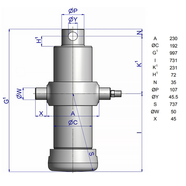 Циліндр легкий, використовує менше масла, що дозволяє швидше підіймати та опускати кузов, і він міцний та не потребує обслуговування. Кількість масла для опрокидування розрахована на 220 бар. Елементи кріплення слід замовляти окремо.