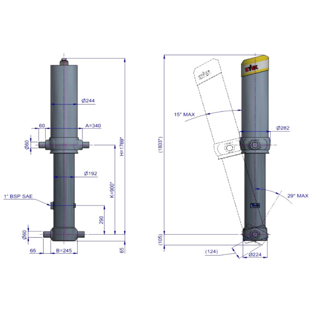 Цей циліндр є лише підйомним пристроєм. Його не слід використовувати як елемент конструкції і не слід піддавати бічним навантаженням. Перекидальний клапан повинен мати скидання тиску на отворі циліндра, встановлене не вище макс. робочого тиску Перевірте максимальне навантаження на циліндр. Робочий діапазон температур становить від -40°C до +80°C. Максимальна тривалість висування становить 0,5 години (за винятком загартованих ступенів із твердим хромуванням). Циліндр пофарбований у чорний колір (RAL9005) з мінімальною товщиною покриття, що відповідає 480-годинному випробуванню в нейтральному сольовому тумані згідно з ISO 9227. ¹ Клапан скидання Hyva.