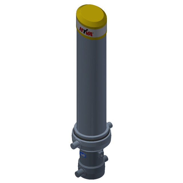 Цей циліндр є лише підйомним пристроєм. Його не слід використовувати як елемент конструкції і не слід піддавати бічним навантаженням. Перекидальний клапан повинен мати скидання тиску на отворі циліндра, встановлене не вище макс. робочого тиску Перевірте максимальне навантаження на циліндр. Робочий діапазон температур становить від -40°C до +80°C. Максимальна тривалість висування становить 0,5 години (за винятком загартованих ступенів із твердим хромуванням). Циліндр пофарбований у чорний колір (RAL9005) з мінімальною товщиною покриття, що відповідає 480-годинному випробуванню в нейтральному сольовому тумані згідно з ISO 9227. ¹ Обмежувач ходу циліндра Hyva.