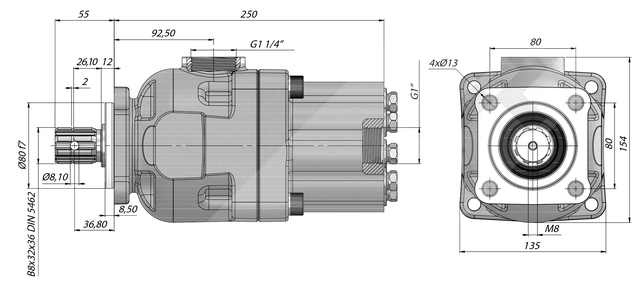 Приєднувальний стандарт: Вал B8x32x36 DIN 6452 (8 шліців, Ø36 мм), Монтажний фланець ISO (4 отвори, 80x80).