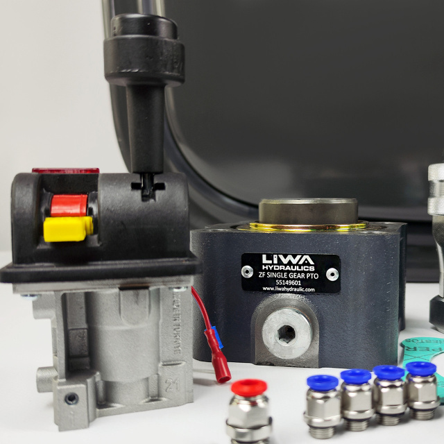 В комплект гідравлічної системи на тягач-самоскид DAF входять вал та коробка відбору потужності на ZF, гідравлічний насос, гідравлічний розподільник, гідравлічний бак, джойстик керування та інші елементи.