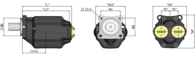 Приєднувальний стандарт: Вал B8×32×36 (8 шліців, Ø36 мм), Монтажний фланець ISO (4 отвори, 80×80).
