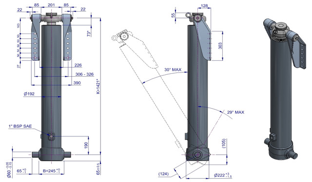 | Максимальне навантаження циліндра (початок перекидання) | 245 кН |