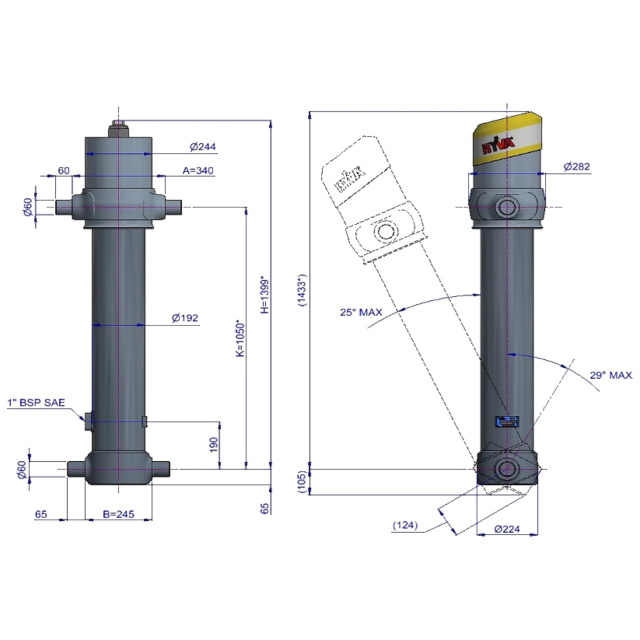 Цей циліндр є лише підйомним пристроєм. Його не слід використовувати як елемент конструкції і не слід піддавати бічним навантаженням. Перекидальний клапан повинен мати скидання тиску на отворі циліндра, встановлене не вище макс. робочого тиску Перевірте максимальне навантаження на циліндр. Робочий діапазон температур становить від -40°C до +80°C. Максимальна тривалість висування становить 0,5 години (за винятком загартованих ступенів із твердим хромуванням). Циліндр пофарбований у чорний колір (RAL9005) з мінімальною товщиною покриття, що відповідає 480-годинному випробуванню в нейтральному сольовому тумані згідно з ISO 9227. ¹ Обмежувач ходу циліндра Hyva.