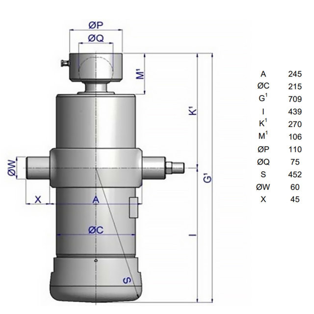UMB 191-5-2280-K270-60-3/4"-HC від HYVA є високоякісним гідравлічним пристроєм. Забезпечений 5 штоками, цей гідроциліндр забезпечує надійну підтримку вантажів в діапазоні від 31 до 41 тонн. З номінальним тиском 220 бар і діаметром першого штока 191 мм, він гарантує ефективне підняття та опускання вантажів.Загальна довжина у розкритому стані становить 2280 мм, забезпечуючи достатній хід для різних завдань. Цей гідроциліндр HYVA – надійне рішення для інтенсивного використання, де потрібна висока вантажопідйомність.