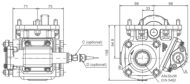 Двошестеренна коробка відбору потужності Bezares на КПП Eaton, для підключення насосів ISO на 4 болти. Пневматичне керування. Установка з правого боку коробки передач. Приєднувальний стандарт: ISO / DIN 5462 A8x32x36.