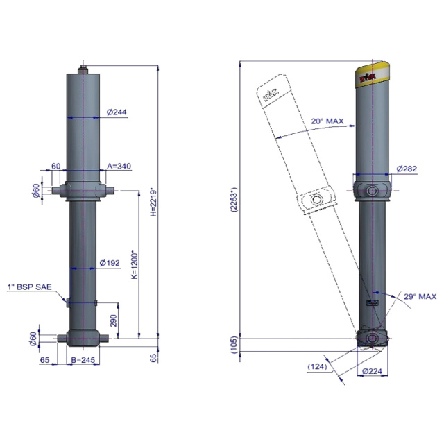Цей циліндр є лише підйомним пристроєм. Його не слід використовувати як елемент конструкції і не слід піддавати бічним навантаженням. Перекидальний клапан повинен мати скидання тиску на отворі циліндра, встановлене не вище макс. робочого тиску Перевірте максимальне навантаження на циліндр. Робочий діапазон температур становить від -40°C до +80°C. Максимальна тривалість висування становить 0,5 години (за винятком загартованих ступенів із твердим хромуванням). Циліндр пофарбований у чорний колір (RAL9005) з мінімальною товщиною покриття, що відповідає 480-годинному випробуванню в нейтральному сольовому тумані згідно з ISO 9227. ¹ Обмежувач ходу циліндра Hyva.