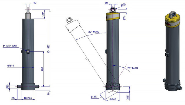 Фронтальний циліндр Hyva FE A191-6-06600-019-K1532-HC з вушком (FE) має 6 штоків і здатний підіймати до 56 тонн, досягаючи загального ходу 6600 мм при тиску 220 бар. Ефективний діаметр складає 191 мм, а вага циліндра становить 286 кг.