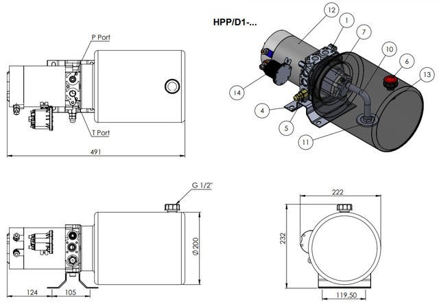 Міні-маслостанція HIDROS P-D21-P13-T08H-10B-H-N (2) призначена для роботи з різними гідроциліндрами. Вона оснащена електромотором потужністю 2.2 кВт, працює на напрузі 24 В DC, швидкість обертання 2500 об/хв, максимальний робочий тиск до 100 бар. Насос станції має робочий об’єм 3.2 см³/об. Масляний бак об’ємом 8 літрів виконаний зі сталі та має циліндричну форму. Пристрій встановлюється в горизонтальному положенні.