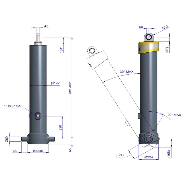 Фронтальний гідроциліндр Hyva FE A169-5-05030-011-K1289 з одним вушком (FE) оснащений п’ятьма штоками та розрахований на підйом вантажів до 57 тонн. Загальний хід становить 5030 мм за максимального тиску 250 бар. Ефективний діаметр циліндра — 169 мм, а маса — 202 кг.