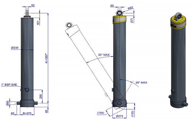 Фронтальний циліндр Hyva FE A214-5-08130-011-K1957-HC з вушком (FE) має 5 штоків і здатний підіймати до 69 тонн, досягаючи загального ходу 8130 мм при тиску 150 бар. Ефективний діаметр становить 214 мм, а вага циліндра становить 428 кг.