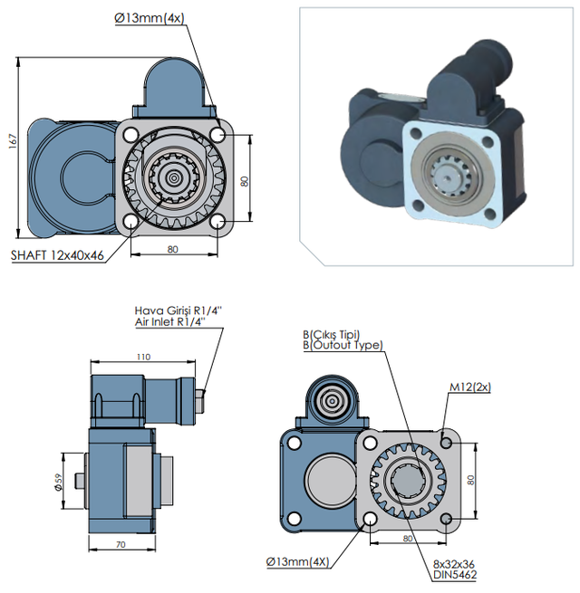 Приєднувальний стандарт: вал B8x32x36 (8 шліців, Ø36 мм), монтажний фланець ISO (4 отвори, 80x80).