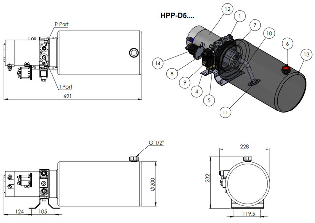 Міні-маслостанція Hydro-pack HPP / D5-0600 призначена для роботи з різними гідроциліндрами. Вона оснащена електродвигуном потужністю 2.2 кВт і працює при напрузі 24 В DC, швидкість обертання 2500 об/хв, максимальний робочий тиск до 140 бар. Насос станції має робочий об’єм 3.2 см3/об. Масляний бак об’ємом 12 літрів виготовлений зі сталі та має циліндричну форму. Установка здійснюється в горизонтальному положенні. Комплектація включає реле, нормально закритий клапан, кришку на бак, станцію з баком та кріплення.