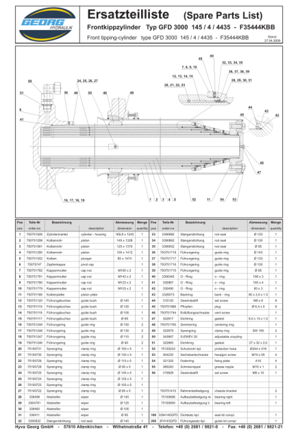До складу ремкомплекта на гідроциліндр 145-4 GFD GEORG HYVA входить весь перелік взаємозамінних конструкційних елементів, які використовуються в гідросистемі обладнання. Деталі дозволять швидко відновити роботу зупиненого через технічні причини обладнання.