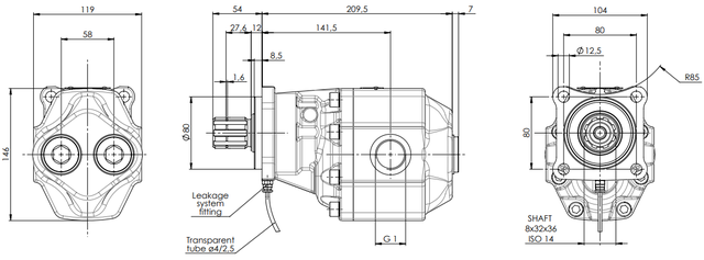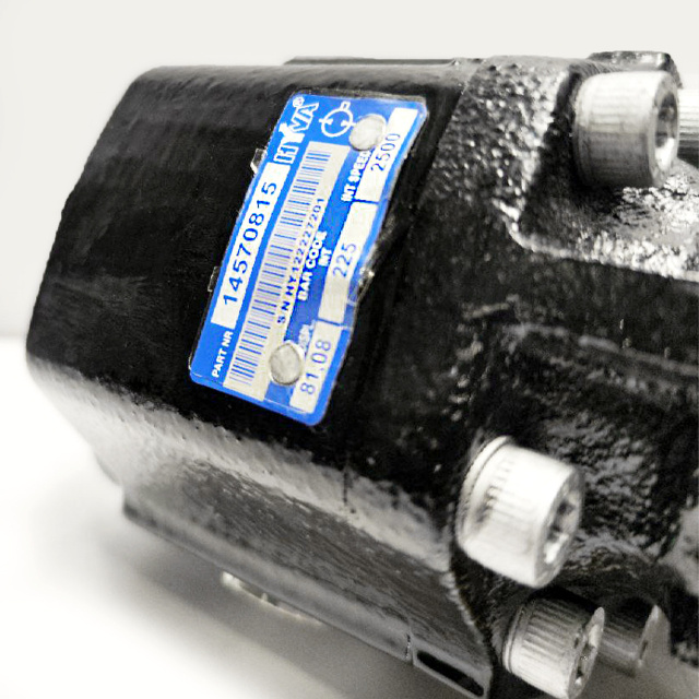 Нерегульований шестерний насос Hyva 14570815 з реверсивним обертанням (Birotational). Робочий об’єм становить 82 куб. см. Розрахований на роботу при тиску 205 бар, пікові показники — до 230 бар. Номінальна частота обертання: 1900 об/хв. Конфігурація портів: 4 порти на задній та бокових частинах корпусу.